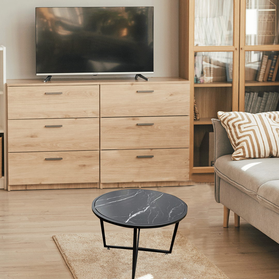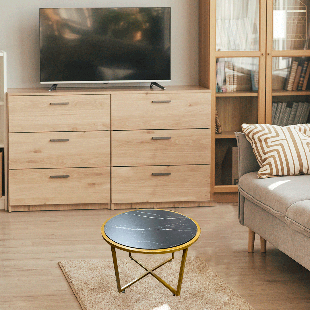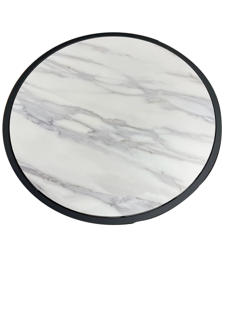 El tablero de esta mesa auxiliar está confeccionado con un material Innovador y versátil que imita la apariencia del mármol, pero carece de porosidad, lo que significa que es 100% resistente al agua y a las manchas en general, su superficie es fácil de limpiar y mantener, incluso con derrames accidentales de café, vino, o bebidas de cola, no dejarán marcas permanentes en la superficie.